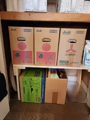 物入れの棚 おトイレ前の物入れ食器、洗濯、風呂、掃除用洗剤のストックや用具を収納している物入れのデッドスペースに棚を作りました。空いた所に、防災用品を入れようと思っています。