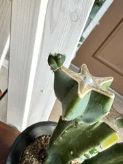 柱サボテン鬼面角カット ブランチ仕立て中の柱サボテンが子株が親株よりも長くバランスが悪いのでカットしました😊カット前の姿今にも倒れそうにバランスが悪い笑😆最初、カッターで切ろうとしましたが幅が足りず、包丁で切ることに。躊躇せずに一気にスパッと‼️可能なら横に寝かせて体重をかけて押し切るのが一番良いと思います🙆綺麗に切れまし