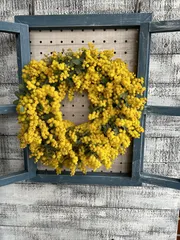 ミモザのリース💛 生まれて初めてミモザのリースを作りました😁一昨日アップした窓飾りに無理矢理飾ってみました😅やっぱりちょっと小さい💦