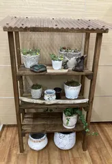 多肉植物の棚 WSで勉強した事や、皆さんの投稿したのを参考にさせて頂いきなんとか形になりました😅屋根が歪んだりで、まだ手直ししなくちゃいけないところもありますが、とりあえず完成です😅 うさぎちゃんはメタリックペイントしてみました😅