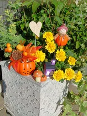 マリーゴールドが可愛く咲いているので、ハロウィンの雑貨🎃🍄たちを乗せてみました🎵