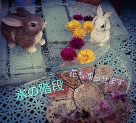 ありがとうキャンペーン 今年最後の作品。氷のテーブルです。ベビーバスに水をはりビオラやパンジー(一番おすすめ)を浮かせます。花は傷んだものでOK。菊(ポットマム?)も試しましたがビオラは適度に沈むのに浮きます。寒波でポットマムは枯れましたが氷付けの物は何故かよく咲いています。寒い日は3センチ以上の厚みになります。毎日並べる