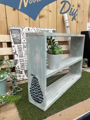 アンティーク風ディスプレイ棚 梨のステンシルがお気に入りです♡下の色に上の色、ステンシルの色ですごく迷いましたが爽やかになりました☺️