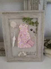 夏のお出かけの額縁 帽子はボンドを付けながらくるくる🌀と巻いていきます✨バッグ👜は両面テープで押さえてチェーン⛓️とバックルを付けました。お洋服が可愛くて、お気に入り🔖です✨