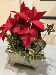 クリスマス寄せ植え 1番近所の店舗でもGWSが開催されるようになったので、はじめて参加してきました! クリスマス寄せ植え✨ 可愛いブリキ鉢♡ヘデラは数種類の中から選べたのでホワイトワンダーにしました。 1番目立つポインセチアをポキっと折ってしまう大失態😭を犯しましたが😱 何とか完