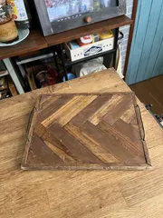 ヘリンボーン柄トレイ😀🎵 介護ストレス発散に久々にDIY😆と言っても、前に端材で作っていたへリンボーン板にワイヤーで取っ手つけただけです。裏はこんな感じ😊🔨先の見えない介護、うまく気分転換しなきゃね🎵DIYもやり続けないと腕が落ちますねー😌11月は仕事や諸々忙しいですがカインズWS1つは予約してるから行くよー❤️