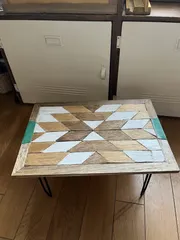 大好きなオルテガ柄のテーブル作りました〜😀前後しますが追加でーす!翌日にクロックドムッシュを作りキャンプ🏕️風に。皆様、台風🌀気をつけましょう〜。前にも何度かヘリンボーン柄は作っていますがこの柄で木片を一枚一枚カットしたのは初めてです😉🎵なかなか根気のいる作業、まだまだ糸鋸ですまっすぐ切れないので修