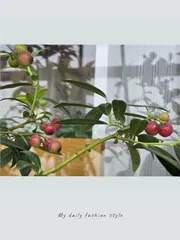 ベランダ菜園2025(🫐ピンクレモネード_⑧赤く色づいて😋♥️) 先週の突風と強風で2度も倒れてしまい🥲ベランダの窓ガラス寄りに避難させているピンクレモネード🫐ですが、しっかりと赤く色づいてくれました💕 ↓避難させた直後の実の様子です。