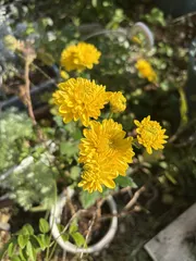 丸い菊だったのに どうしてなのか😅なんとかマムとカタカナの名前でした。下の袋の中まん丸い黄色い菊(一月のお楽しみ袋)なんですがこの秋、普通の菊に変身しちゃって💔どうしたものか⁇丸くする技があるのでしょうかね?