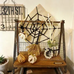 ナチュラルカラーのマクラメパンプキンファブリックパネルに黒ロープでくもの巣🕸コルク瓶の一輪挿しパンプキンクリスマスも使えるようにリースをプラスして、一輪挿しはディフューザーにチェンジしました。100均イーゼルに焼き網とまな板でDIYしたレターラックをのせて大人ハロウィン❤︎ 先日、信楽陶器