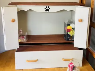 木工DIY部門 大好きだったペット達へ お仏壇 ■作品内容今まで飼ってきたネコちゃん達わんちゃん達のお仏壇を心を込めて可愛く作りました ■こだわりポイント肉球の印と鏡開きの戸下の引き出しには思い出の写真など物入れに