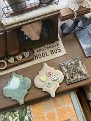 タイルブローチ新作発表😊⭐️ 以前から作っていたドットブローチに引き続き、数字やアルファベットロゴを手描きした物を作りました🫶慣れてきたらイベントでオーダーメイドで作りたいな💓欲しい方いるかしら?まずはmyピン🧷にしてみました❣️