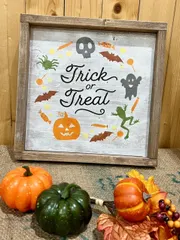 ハロウィンキャンペーン2022🎃B&B シェルフベンチ WSで作りました!カーキ色をベースにシャビーな感じに塗り、字はグレーで😁カインズさんに置いてあるジャコウランタンを拝借してパチリ📸✨
