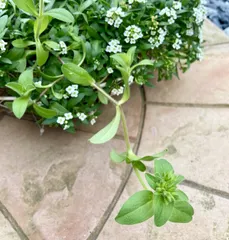 ベアグラスとアリッサムのリースようやく🌸花がちらほら咲いてきました。こぼれ種かな?🤔ペチュニアかな?🤔なんだか育ってる