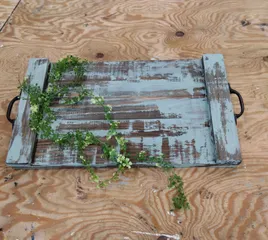 アンティーク塗料のカフェトレイ 思いの外簡単にトレイは作れました。塗料の塗り方が、中々難しい。かすれ具合が上手く出せませんでした。多肉植物を乗せたくて、外に出せるように塗料を選びました。