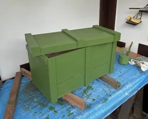 リンゴ箱リメイク⑤塗装しました〜 さて、蓋つけて一気に箱らしくなったリンゴ箱。https://diy-square.cainz.com/announcements/yaens3dfccisuq35今日はいよいよ塗装します。みんな大好きウォルナットにするつもりだったんだけどこれまた路線変更〜。使う塗料はこれ⬇️2022年にランク5達成