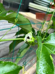 パッションフルーツを100倍楽しむ方法 まずは第一花の実、かなり大きくなりました。今日も3輪咲きましたよ。風もなくタイムラプスの動画とても綺麗に撮れたんですけど花が咲くのと雌しべが雄しべに近づくののスピードに差がありすぎで…。再生したら開花が文字通り一瞬なんですよね〜。風情も何もあったもんじゃないので、開花と雌しべの動きの2回に分けて撮っ