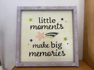 DIYを始めて1年半になりますが、この度初のフレーム付ミニサインボードに挑戦しました。いろいろ思い描いていたのですが実際には全然違うイメージのものになっていました💦工房隣の席でモダンな大人かっこいい作品の方の作業の速さにドキドキしながらマイペースで普通な感じに私のは仕上がっていきました💦フレームには