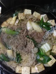 我が家は家族がきのこと春菊は食べないので白菜、ネギ、白滝、焼き豆腐だけのすき焼きです😊🎶群馬県なので野菜が煮えてからお肉を入れます😉💕🎵