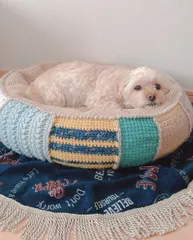 わんわんベッド ■作品内容編み残った毛糸達を寄せ集めて【わんわんベッド】編んでみました🐶🛌残り毛糸ならではのパッチワーク風でオンリーワン🐶のベッドが完成✨🫶■作品のこだわりポイントベッドの端にお顔を乗せ易い高さにして、ゆったり寝れる大きめサイズ😴すぐヘタらないように綿もたっぷり入れました。😊⬆️⬇️ 作