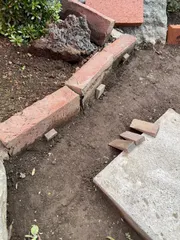 レンガで仕切ってる花壇、端材をストッパー代わりに 細長い三角形の端材は、以前「杭」を自作した時に出た端材です。最近整備してるレンガを立てての仕切りは、今のままだと足癖が悪い時には、ぶつかってレンガが倒れてしまう事も。どれだけの効果か?は分かりませんが、対策として施しました。↓施工した箇所です。