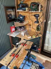 初投稿!ベランダ工房! 自分もDIY楽しんでいる身としてカインズスクエアに初参加! これは新居に引っ越して自身の工房が欲しいとベランダの一部を改造した物。 ラブリコと少しだけフレンチクリートしてます。 結局手狭になり半年くらいで違う所に工房を作る事になりました笑 その変化