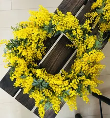 ミモザでリース ミモザの花も終わりに近づいてきました。なので、リースを作りました。まだ、余っていたのでスワッグと言うものを作ってみたので次の投稿でお見せしますね。