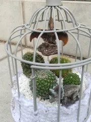 サボテンの寄せ植え クリスマスに加工した100均の鳥かご、やっとサボテンを植えました。プテラノドン、飛んでます!