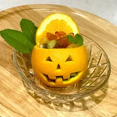 ハロウィンキャンペーン2022【オレンジのジャック・オー・ランタン】 オレンジの皮をくりぬき、フルーツを詰め込みました。作ってワクワク♬眺めてワクワク♬楽しいおやつが完成しました🥰