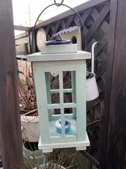 アンティーク調に仕上げるランタン風木製ケース ランタンケース作ってきました😊ブラウンとホワイトは以前作って、今回で3色揃いました💚バニラでアンティーク加工してます✨ソーラーライト💡を入れて庭に置いて オレンジ色の暖かい光でとってもいい感じ💕😆ブラウンのは風で一度飛んでバラバラに🥲窓枠がとても弱いので 裏から補強必要です!再組立大変でしたので今回