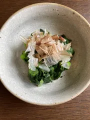 ひとりランチのお供!新鮮のらぼう菜! 庭で取って、サッと洗ってレンチン!鰹節たっぷりの、のらぼう菜!甘ーい🥰