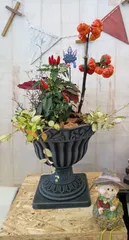 ハロウィンの寄植え トウガラシ🌶 黄金テイカカズラ の5種いつもの寄植えとは違って土を取ったり根っこをほぐしたりせずポットからそおっと出してそのまま鉢へ入れたのが多かった。ソラナム エチオピクム🎃が一杯 ナス科🍆なんだって❣テイカカズラは4つにわけて植えました。ササーッと寄植え30分もかからず終了。待ち時間のほうが長か