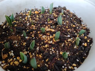秋に植えたチューリップの芽が、こんなに育ちました😄前回、投稿したときは芽が出たばかりでしたが、あれから寒い冬を乗り越え2月に入り急に成長してきました🌷春の訪れが待ち遠しいです🥰 こんなに大きくなった芽も