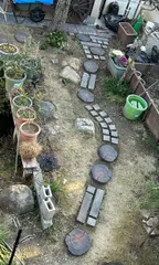 庭の小道造り 昨年芝生を張ったんだけど、1年も経つと人が歩くところは禿げてきちゃったので敷石を置いて小道を造ることにしました。使うのはハンズマンで買ったコレ⬇️10枚とと1年前にコ✖リで買ったコレ⬇️を3枚分バラしたものとりあえず丸い方をデデデーっと並べてみて…ばらしたやつを足したり、引いたり、あーでもないこーで
