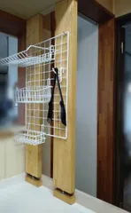 ボカシ強めですいません💦乱雑過ぎて😅 いただいた端材で柱をつけました。ドアを開けていると玄関から丸見えの場所なので目隠し効果とちょっとした物置ける収納スペースが欲しかったので。玄関側から↓棚はガチャ柱で付けたかったのですが百均で見つけられず家にワイヤーネットとネット用カゴが余ってたので妥協