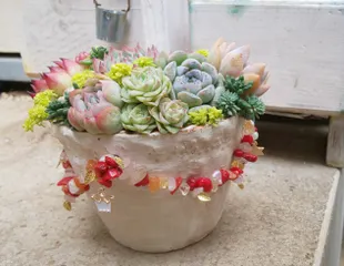 フラワーマーケットでpotsさんのWSで鉢にビーズや石で飾りを付け、寄せ放題で寄せ植えしました☺️お家に帰ってから写真撮りましたはぁ~多肉が紅葉していてかわいいな~💕