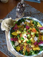 農家さんのお野菜で・・・・ ■作品内容 カラフル キラキラ*野菜サラダ ■工夫ポイント 農協などでカラフルな野菜を探して前準備しておきます。教会学校の愛餐会に毎年差し入れするのですが、お肉類やお菓子が多いので、わたくしはフルーツや野菜のサラダを差し入れます。仕上げはナッツや木の実、アラザンなどで。毎年、形は毎年様