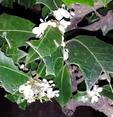 柊の花 今日は家族が南天や柊の剪定してくれました😊🎶私は切った枝や葉を片付けました😉💕柊にお花が咲いていました😊🎶トゲのある葉なのに可愛いお花ですね🩷