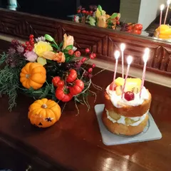 ハロウィンキャンペーン2022 先日の初アレンジメント💐と、 birthdayケーキ🎂です🤩 来年もチャレンジしてみよう🥳