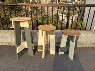 月1ペースでこの『インパクトドライバーを使ったパピーの丸椅子』も今回で3回目になります😊💕✌️今回は右側のキッズサイズを作り、3個とも同じ塗料を使っていますが、塗る位置を変えました😄🎶毎回、学びの多いWS❤️特に興味をひいたのはこの椅子は『風水尺』を元に寸法が決めてあること😳❗️3個とも、それぞれ運