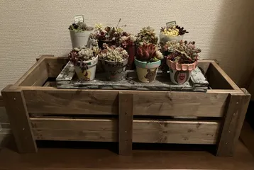 脚付き木製プランターカバー 午後はお一人様でとっても贅沢なWSでした☺️ご指導ありがとうございました🥰作品が大きく、塗装が思いのほか大変でした😇ひとまず、玄関で寒さ避難中の多肉さんたちの置き場所となります🌵