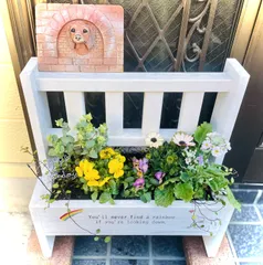 寄せ植え完成🪴✧*。🎁お届けしました⑅ 母の誕生日🎂プレゼント🎁ベンチ型プランター作りから始まりワイヤークラフト作成🙌そして最後の作業は寄せ植え🪴仕事終わりに花苗を見に行く日々💦何店舗かまわってやっと寄せ植えに使う花苗が揃いました。そして時間がないので、夜に玄関で寄せ植え🥲何とか誕生日前日に完成😭 今回の寄せ植えのワイヤープラン