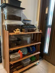5歳になる孫が 大の昆虫🐞🐜🦗🪲好きで息子が休みの日は一緒に採取に行きたくさん採れてケースが溢れてきました😆これから秋に向かって 繁殖させてるみたいですそのケースの棚を スノコで 檜6枚貼り 1枚桐4枚貼り 4枚 で作りました 桐スノコを使ったことで予算内でできました桐は、強