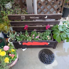 フェンス付き木製プランターカバー 12月初めに プランターカバーを花壇風にして植え込みました 間には去年のチューリップが仕込んであります!左の金魚草 ちょっとしおれてきた😅購入してポットのまま2週間ほど出番待ちだったので元気がありません💦💦ゴメンね〜 ★はまたこ