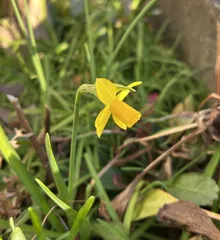 今日の庭パト 我が家のスイセン開花第一号。丈が短い小さめのスイセン。球根も小さいので、毎年どこから出てくるのかわかりません。😅最初はまとめて植えてあったと思うのですが🧐…あちこちからポツンと咲いてくれます。増えると嬉しいな。