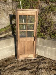 アンティーク風ドアオブジェのその後 今年初めてのワークショップで作ったドア。工作ネットを付けてそのままでしたが、この週末にやっと庭に設置出来ました。 想像していたよりドアに風を受けるので、何か付け加えようか迷っています。もう少し暖かくなったら、ドアの前にアガベを植える予定です。