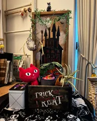 プランターカバーや、ステンドグラス、ロウソク、缶、チョコレートなど、ハロウィン仕様のモノを集めて飾ってみました。なんだかワクワクします♪