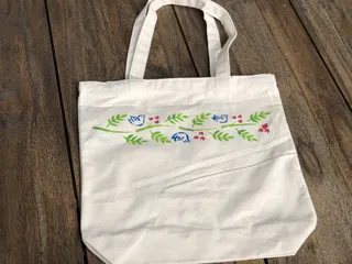 ステンシルエコバッグ♪ ステンシルエコバッグ、作ってきました。ごめんなさい、あにーさんのと激似です🙇♀️クリスマスリースやツリーのステンシルもあったり、過去のも使っても良いわよ、といわれたけど、やっぱり鳥ちゃんが可愛くてね💕使った色はリーフグリーン、ブルー。ポスカの赤です。なんとなく周りにステンシルの色がはみ出したりで汚