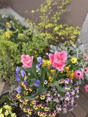 紫の寄せ植え デッカー植え② 以前投稿した紫のデッカー寄せ植えhttps://diy-square.cainz.com/announcements/dfl2jewganigzqteチューリップの色が黄色→オレンジに変化してきました😆もうすぐ終わりかな😆