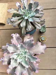 大きさ比べ ■作品内容うちのデカベリアちゃん。 ■工夫ポイント我が家のデカベリア、高砂のジイとブルーフリルズ(多分笑)3号ポットと比べてみるとその大きさがよく分かりますね笑🤣 ※以下多肉ハック部門のみ入力■材料■工程